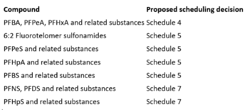 The proposed scheduling decisions apply a tiered risk management framework across the PFAS classes instead of a blanket Schedule 7 listing, which provides a prohibition on imports and use. Schedule 4 and 5 chemicals are subject to managed phase-down through transition requirements, use restrictions, and waste controls that are not as strong.
